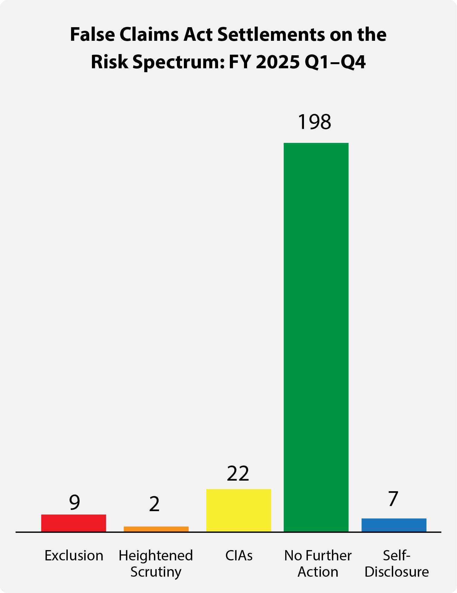 The government's primary civil tool for addressing health care fraud is the False Claims Act (FCA). Most FCA cases are resolved through settlement agreements in which the government alleges fraudulent conduct and typically the settling parties do not admit liability. Depending on the facts and circumstances presented, OIG will usually pursue one of the following approaches when settling a health care fraud case: (1) exclusion; (2) heightened scrutiny; (3) integrity obligations; (4) take no further action; or (5) in the case of a good faith and cooperative self-disclosure, release 1128(b)(7) exclusion with no integrity obligations. OIG’s Risk Spectrum illustrates these approaches. For more information on how OIG evaluates risk to the Federal health care programs and the criteria the OIG considers in evaluating exclusions in False Claims Act cases, see OIG’s April 18, 2016 notice.