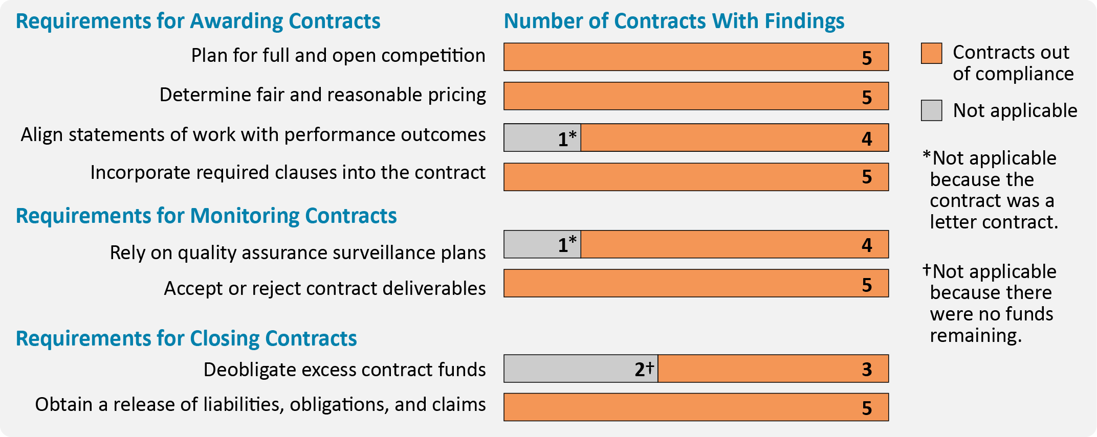 ACF did not comply with Federal requirements when awarding, monitoring, and closing out the five contracts as shown below.